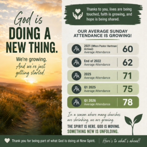 When Pastor Hartman arrived in 2021, our average Sunday attendance was around 60. By the end of 2022, that number had only moved slightly to 62. But over time, something has been building.