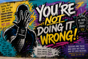 That is why this sermon thread matters so much: you’re not doing it wrong. If your prayer is angry, you are not doing it wrong. If it is grateful, you are not doing it wrong. What f your prayer is clumsy, distracted, or unfinished? YOU ARE NOT DOING IT WRONG! If all you can manage is “God, help,” you are not doing it wrong. If you sit in silence because grief has taken your words, you are not doing it wrong. Prayer is not a speech contest. It is bringing your real life before God.